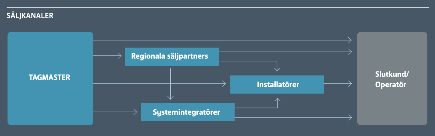 Affärsmodellen bygger på att erbjuda “one-stop-shop solutions” där teknologi och mjukvara kombineras. TagMaster tar ett långsiktigt ansvar för levererade produkter, vilket skapar stabilitet för kunderna och återkommande affärer – över 80 procent av kunderna är återkommande.