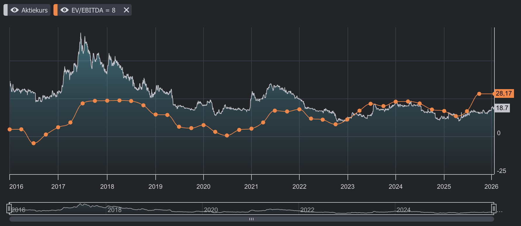 Aktien handlas för närvarande till 5,6x EV/EBITDA, en betydande rabatt jämfört med före pandemin då bolaget handlades till cirka 15x. Mitt estimat för fair value ligger på 9–10x EV/EBITA, vilket motsvarar en aktiekurs på 26–31 SEK – en uppsida på cirka 40–65 procent från dagens nivå på 18,7 SEK.